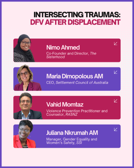 The article brings features some of our panel’s highly experienced voices: Juliana Nkrumah AM, whose decades-long leadership in gender equality and refugee women’s empowerment has inspired change nationally and globally; Maria Dimopoulos AM, CEO of the Settlement Council of Australia and a tireless advocate for women’s rights and cross-cultural understanding; and Nimo Ahmed, co-founder of The Sisterhood, who has established safe spaces and leadership opportunities for refugee women in Indonesia. We’re also very pleased to welcome Vahid Momtaz to the panel, a psychologist and practitioner supporting refugees in New Zealand, whose work focuses on violence prevention and mental health interventions for displaced families.